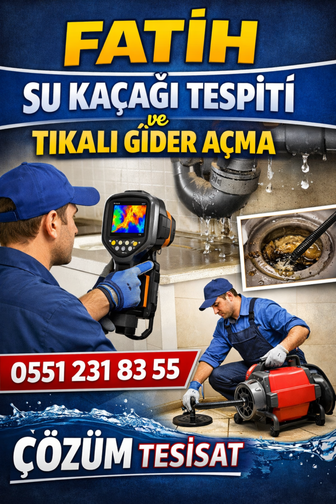 Çözüm Tesisat Fatih şubesi telefon numarası 0551 231 83 55 tir kameralı su kaçağı tespiti , robotla tıkalı gider borusu açma için bizimle iletişime geçebilirsiniz. Diğer tesisatçılardan farkımız işlemeri kırmadan dökmeden yapmaktayız. Neden kırmadan işlem yaptırmalısınız ? çünkü kırılarak yapılan işlemler size daha fazla tamirat tadilat masrafı çıkarır sağlam olan yerler de kırılacağı için ister istemez eviniz  şantiye alanına döner işe tam da bu sebepten kırmadan dökmeden hizmet veren firmamızla çalışmalısınız.